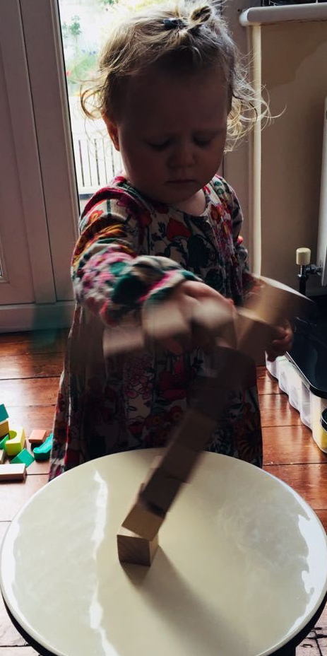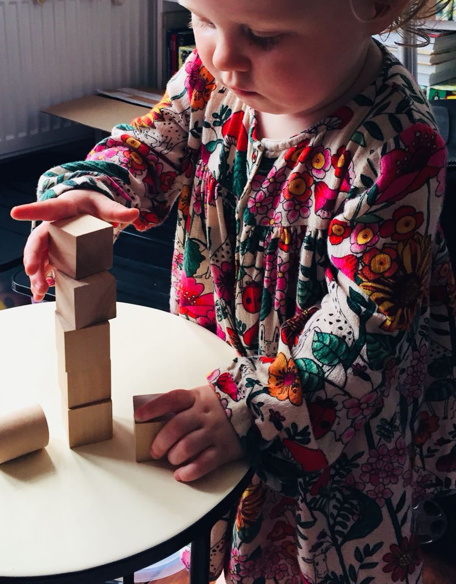 These blocks have a range of play values throughout early childhood. Initially a toddler enjoys the process of placing one block on top of another. This requires co-ordination and concentration, releasing that grip on the block as it’s placed into position on top of the other. Daisy has practised this skill for several months now and is competent at stacking blocks on top of one another.