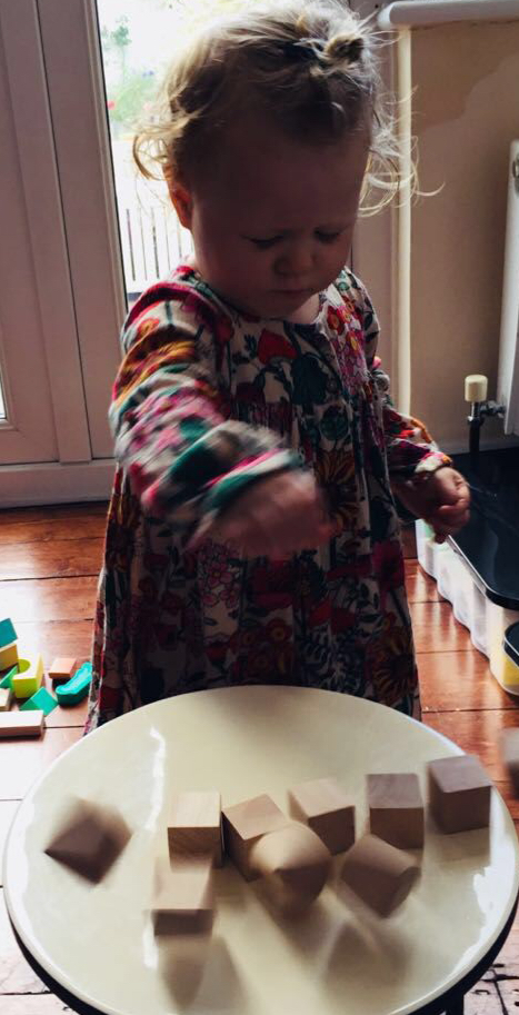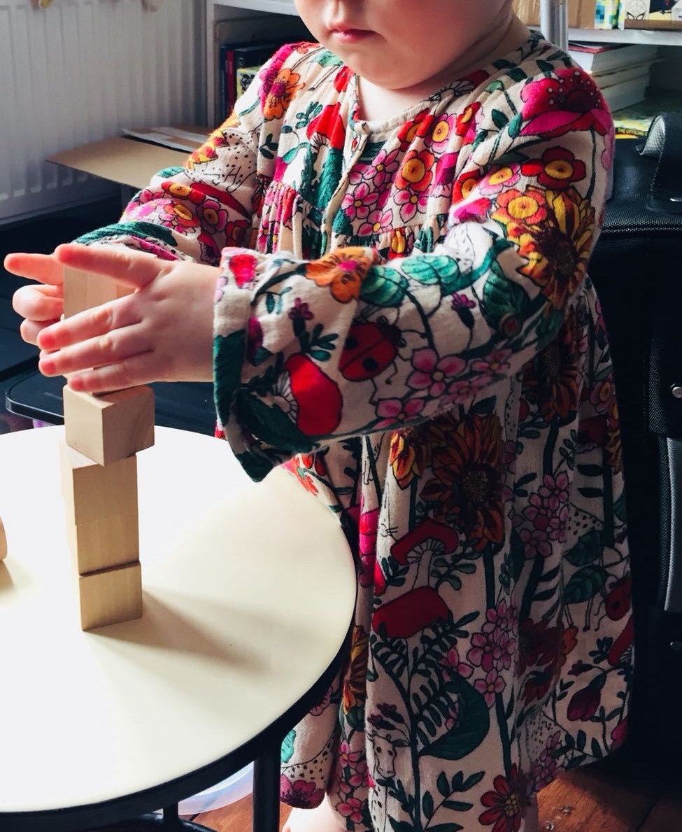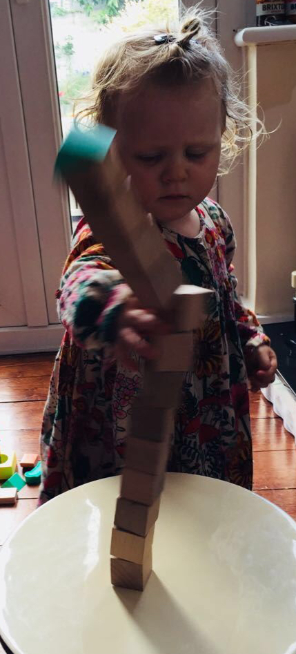 She enjoys making a tall tower of blocks and also enjoys practising that other equally enjoyable skill of then knocking down the tower.