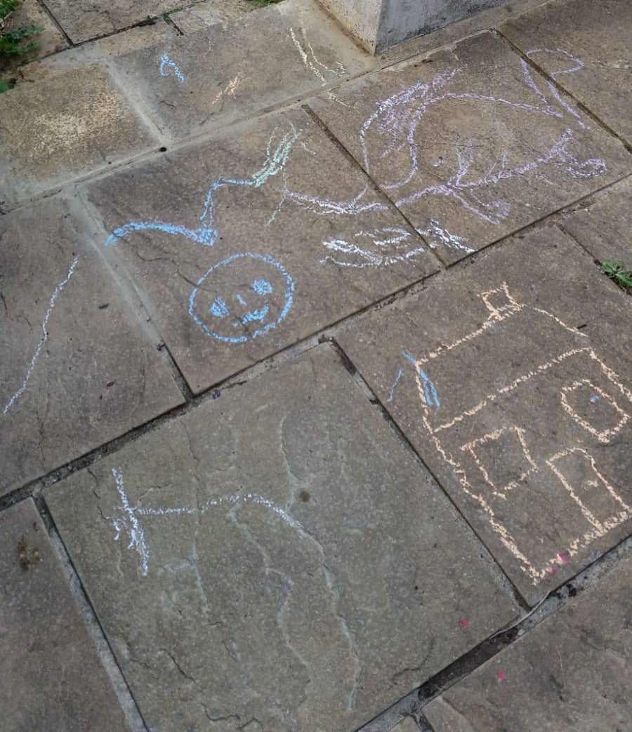 Word of warning – if your grandchild has recently enjoyed participating on a vertical colouring wall and also enjoyed using chunky chalks on the garden wall they have become aware that vertical art work is possible. And they will be tempted to do more mark making by that clear area of emulsioned wall, particularly if crayons are accessible.