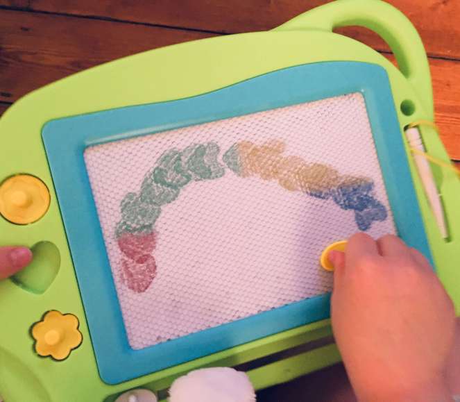 But this magnetic board means she can practice and explore colourful mark-making with some privacy and independence; crucially, she can experiment without a grownup assessing her work, and there isn’t the rigmarole of cleaning up afterwards: she simply swipes the bar over when she’s finished.