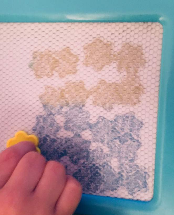 Daisy has even used the board to practice her counting, by making blocks out of rows and columns of stamps (again, the influence of Numberblocks is evident) and counting aloud as she goes, or sometimes counting the impressions out in a line.