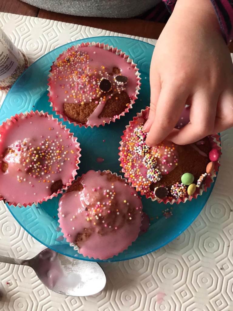 Early on, I focused on involving her in the process of making glacé icing, using water and icing sugar. You need to achieve a delicate balance here – the trick is not to make icing too runny for a child to use but not too stiff that it won’t drop off the spoon!