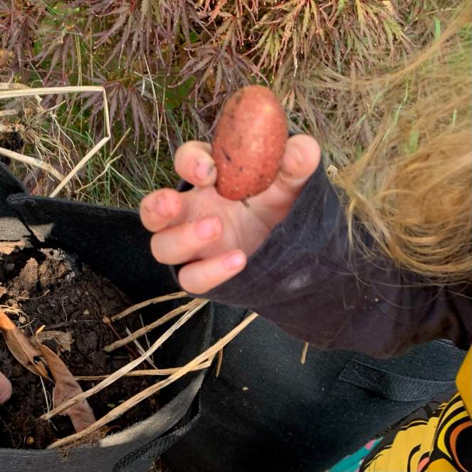 The standard gardening advice for harvesting potatoes in a sack or large tub is to tip the container over and sort through the contents, but that didn’t seem to be as much fun for Daisy as unearthing them, a few at a time!