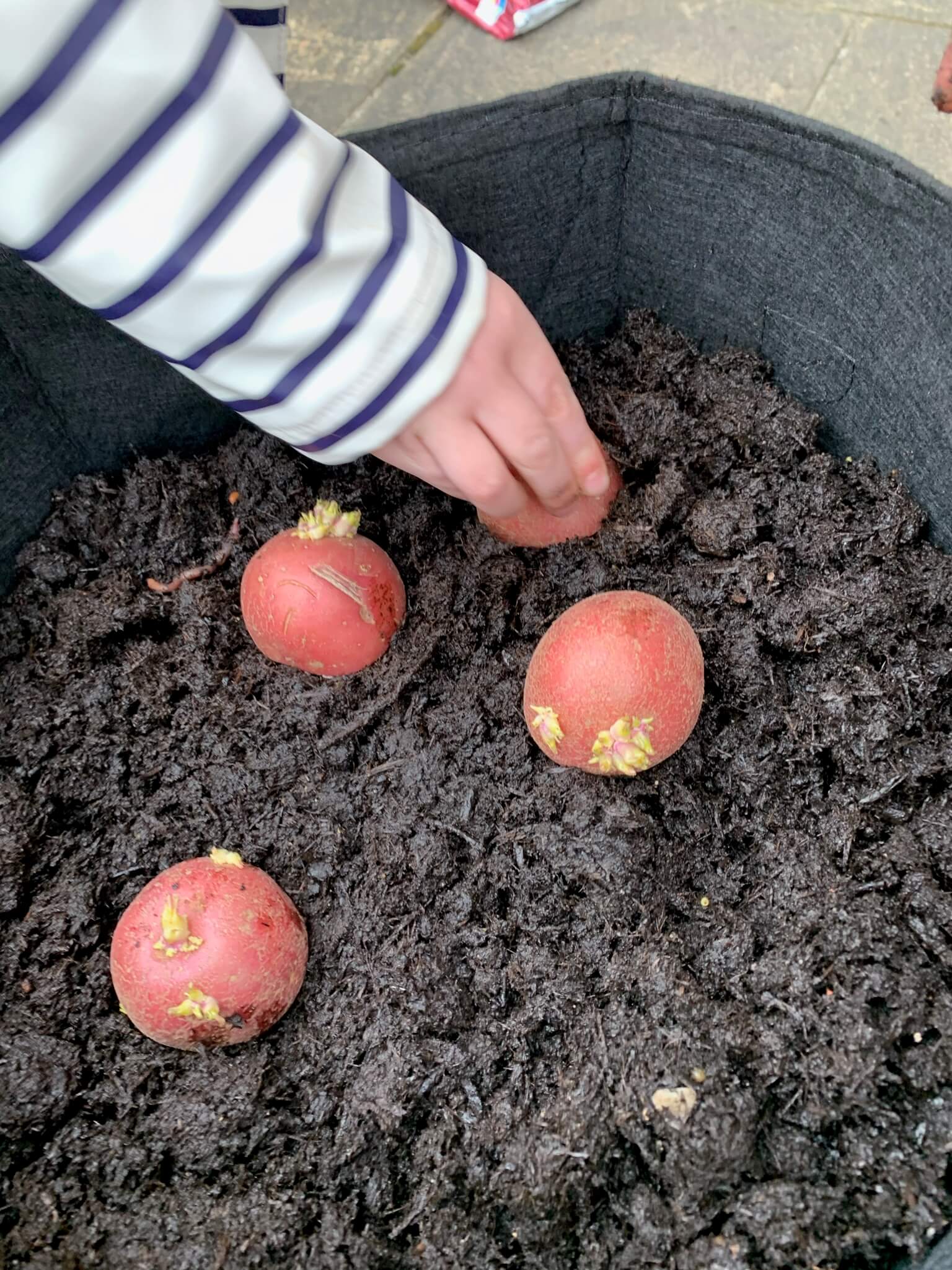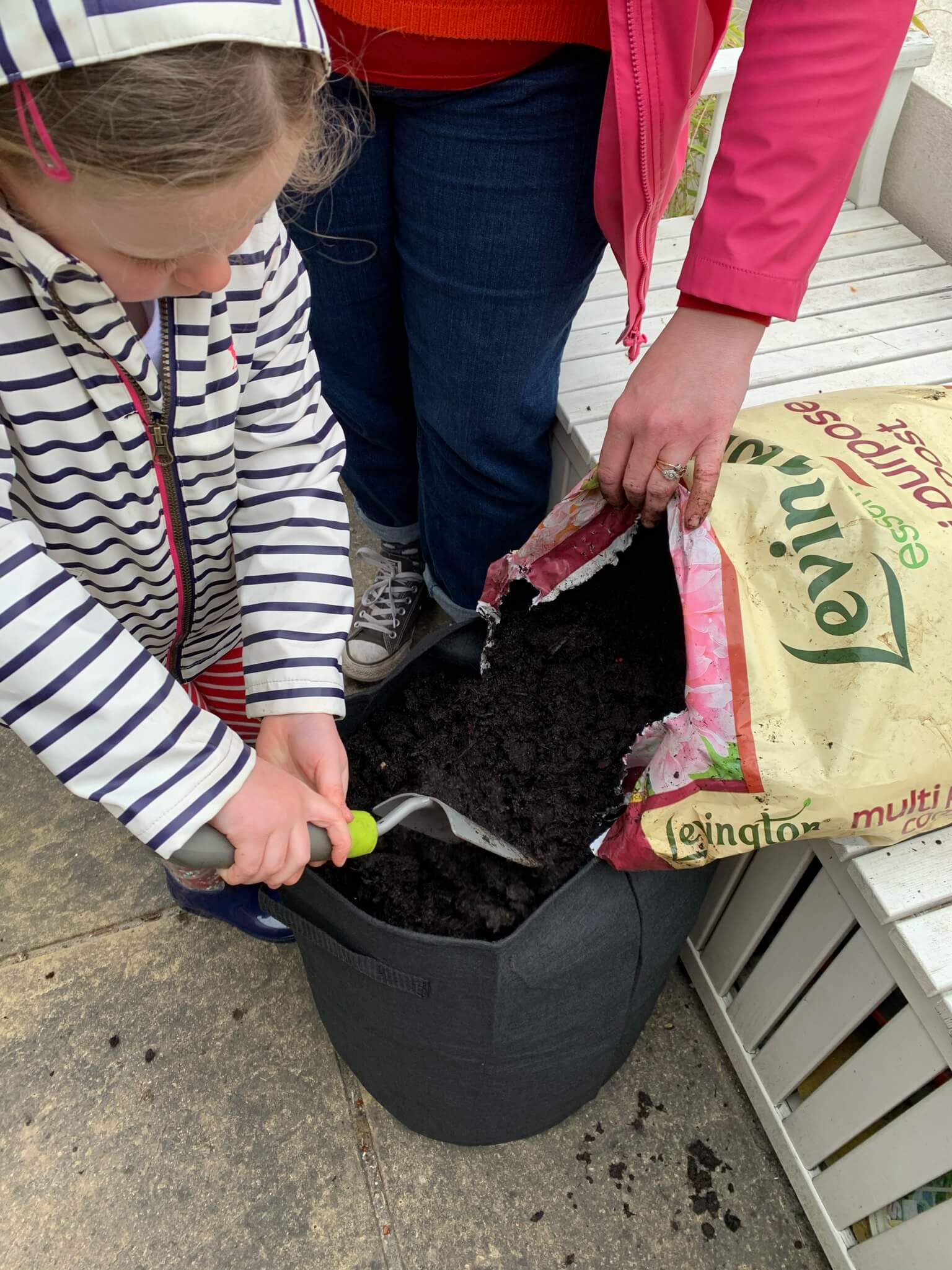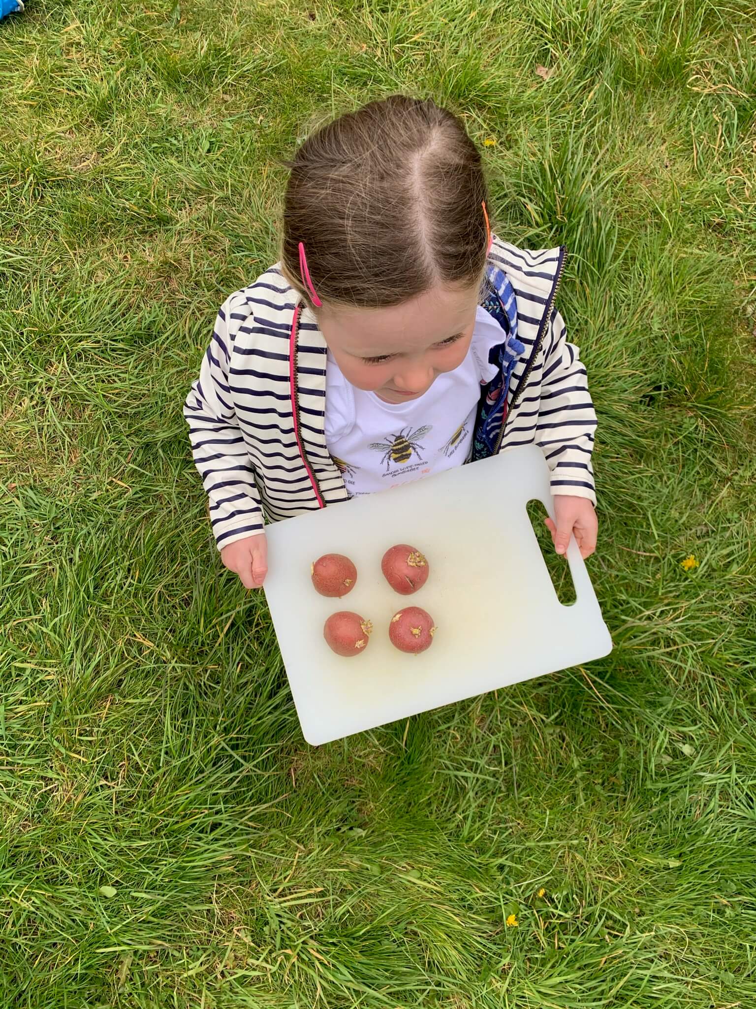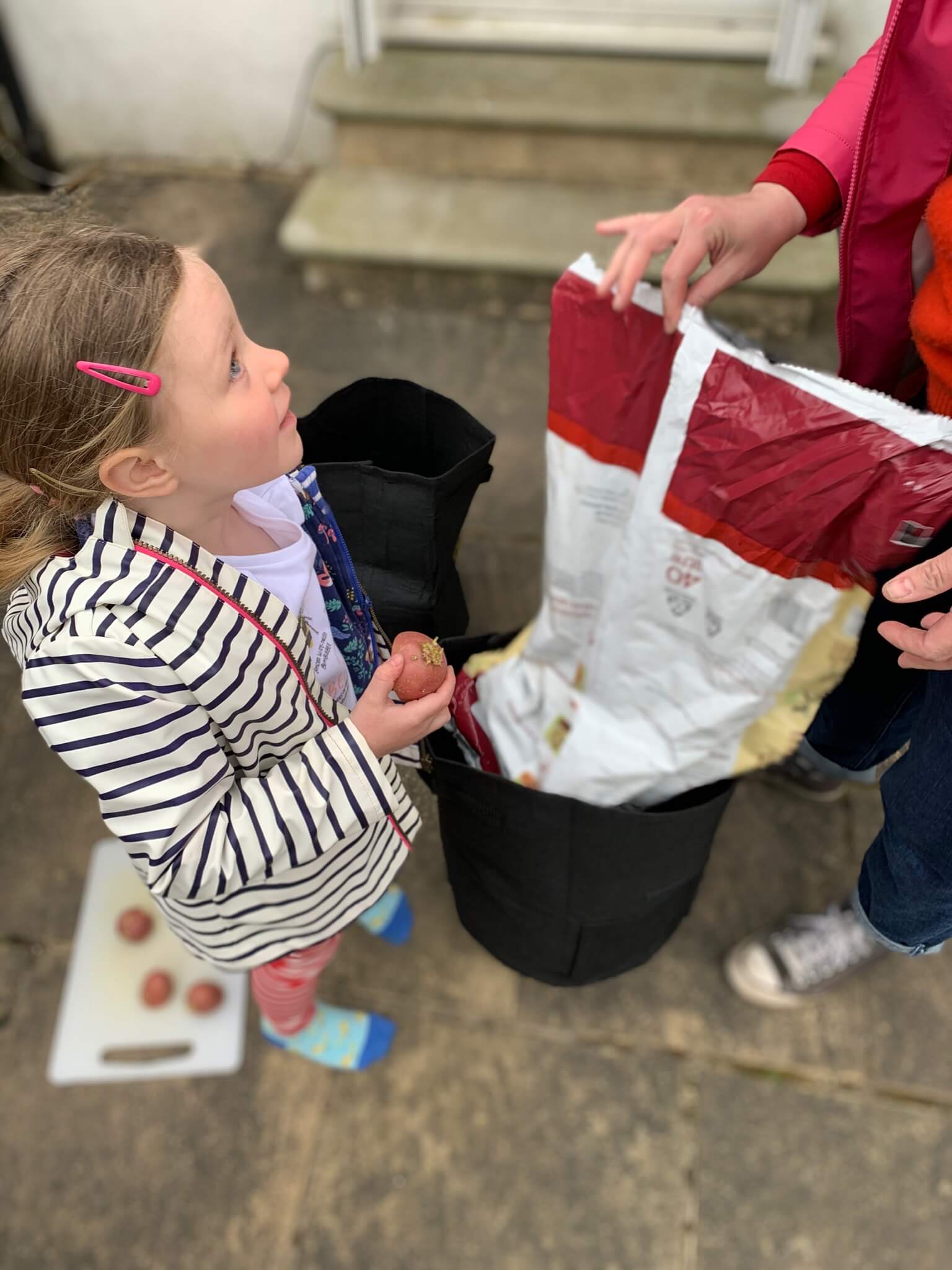 Once the frosts had gone in late April, planting potato cuttings into growing sacks gave Daisy the opportunity to use these nurturing experiences, planting and watering the vegetables and seeing them grow, flower and change through the spring and summer seasons, until they withered and it was time to harvest her crop.