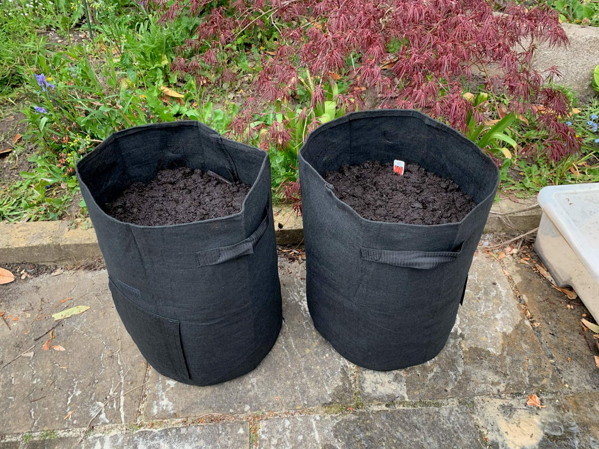 And so they continued to work on tidying the borders, until Grandpa spotted the dark shapes of potato-growing sacks against the back flower bed. The foliage on the potato plants had withered and was drying. It was time to harvest the potatoes!