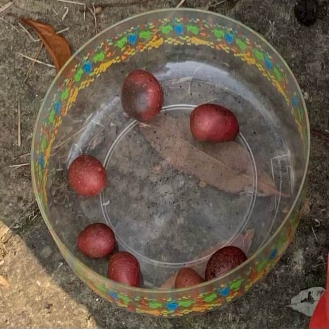 Daisy stopped her work in the mud kitchen because she wanted to help with this harvest. In the past she has helped us to pick tomatoes from the tomato vines, selecting the ripe red fruit and enjoying it soon after; she has also picked a couple of apples from the small tree in her parents’ garden. But potatoes are somehow different: they’re like buried treasure – you don’t know what’s there until you move the soil!