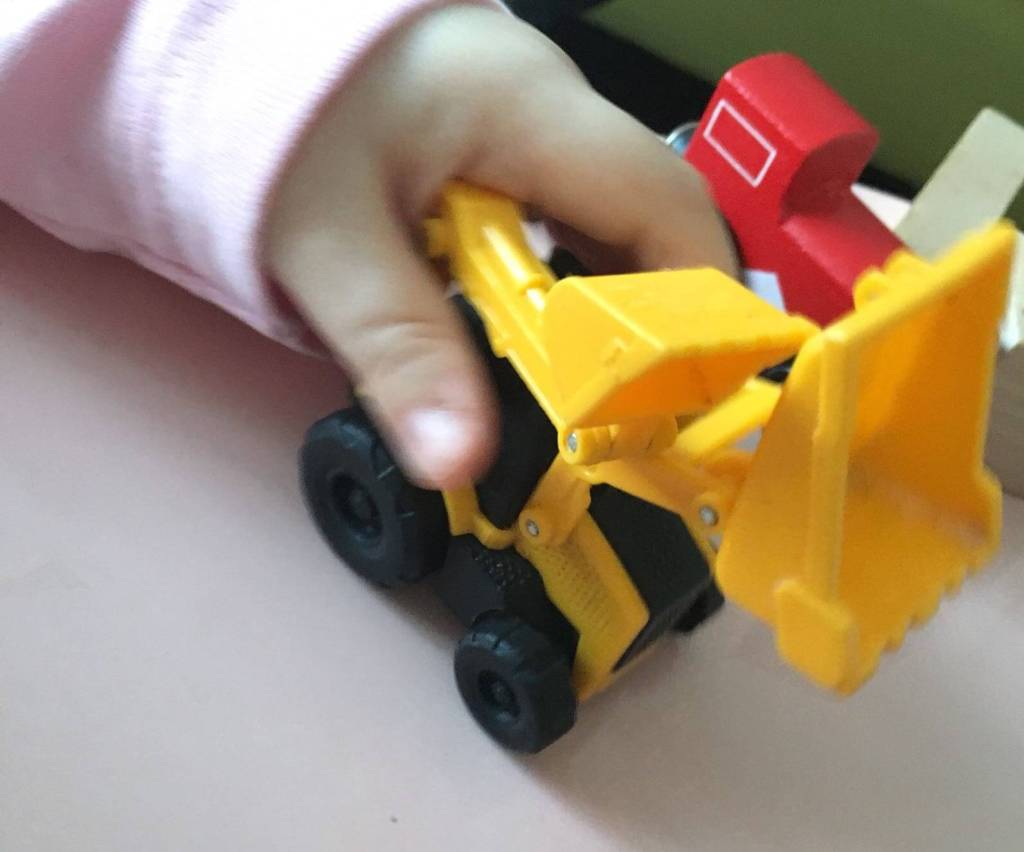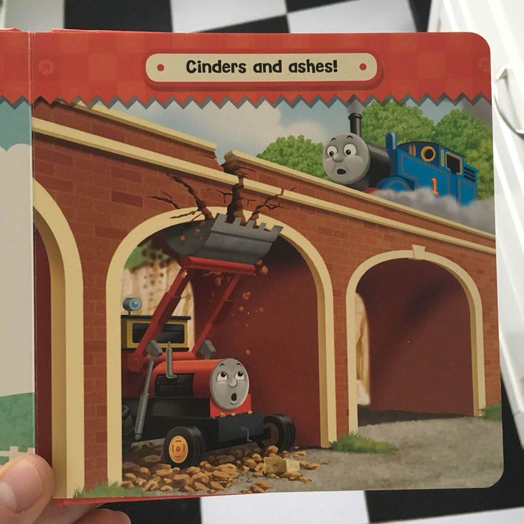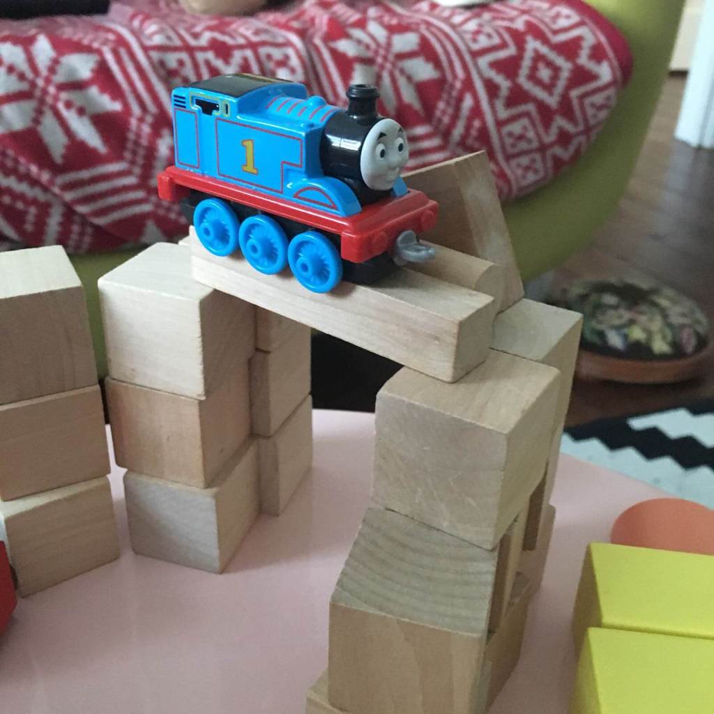 After reading Thomas the Really Useful Engine, Daisy found her wooden bricks and Thomas toys so that she could recreate a 3D version of the bridge scene where the tractor Jack uses his front loader to support a crumbling bridge arch, as Thomas coasts over it, exclaiming “cinders and ashes!”